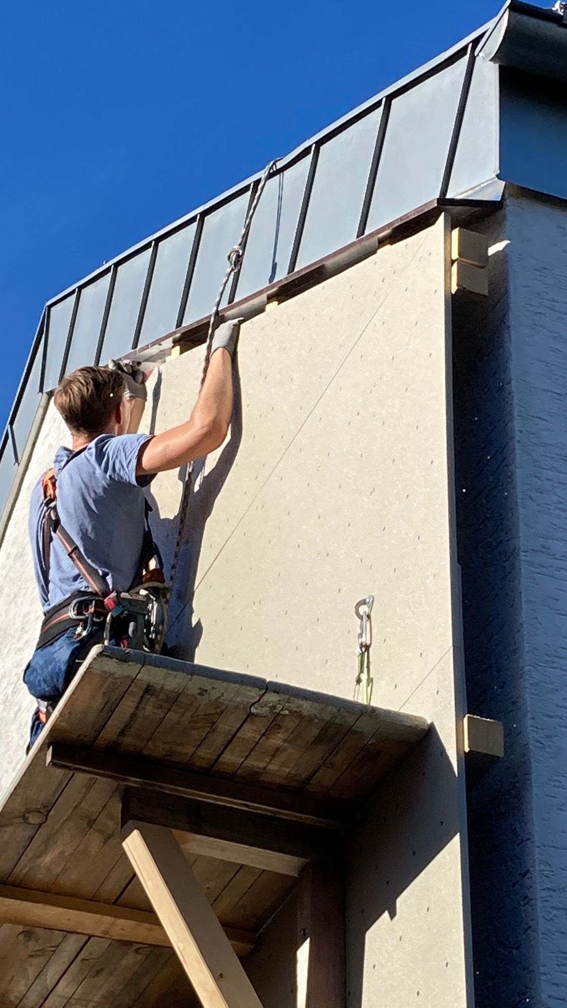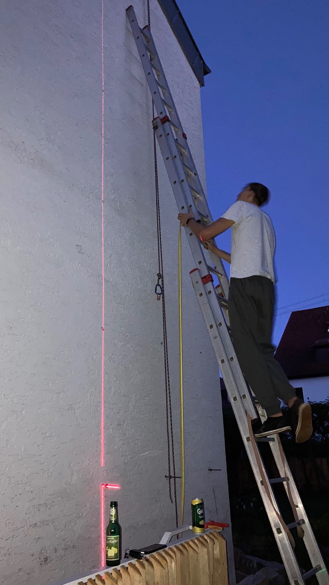 #FAKTEN: 3 Wochen Planung und Vorbereitungszeit, 3 Tage Bauzeit, 731 Kilogramm Holz verbaut, 768 Einschlagmuttern mit der Hand am Arm eingeschlagen, 17 Ankerpunkte in die Hauswand gesetzt, 175 kg Quarzsandbeschichtung aufgetragen, Fertigstellung Juli 2020
